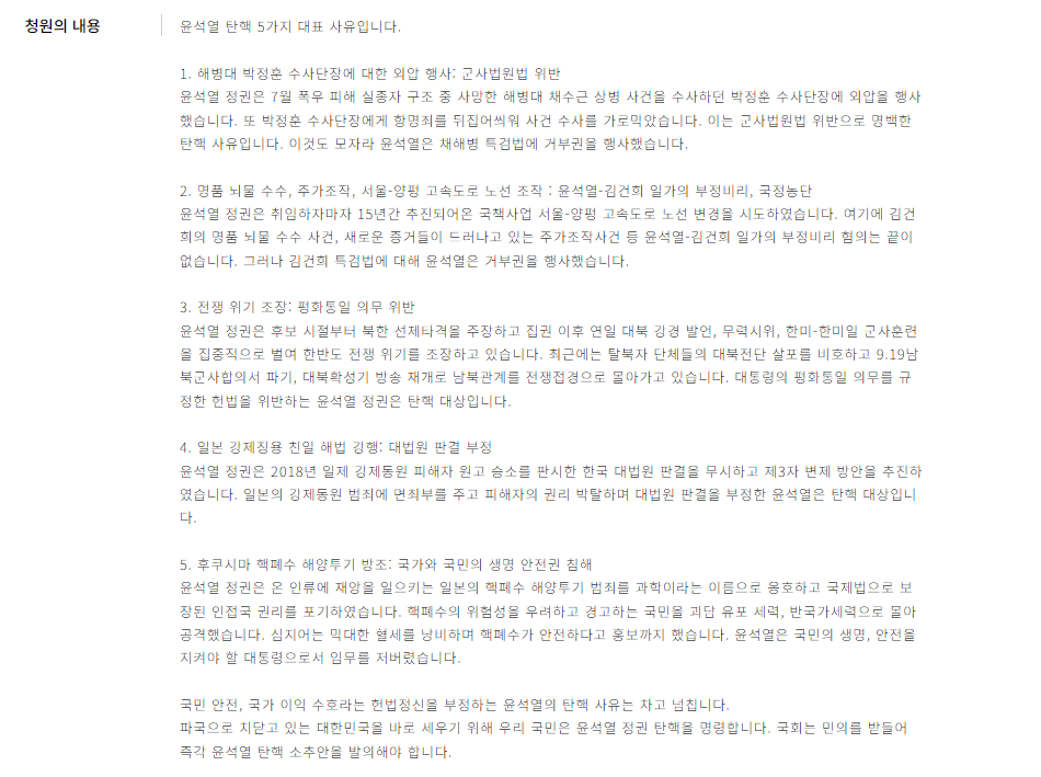 6월 20일 ‘윤석열 대통령 탄핵 소추안 즉각 발의 요청에 관한 청원이 등장 하였습니다. 청원의 내용은 5가지의 대표 사유를 제시하고 있습니다.
